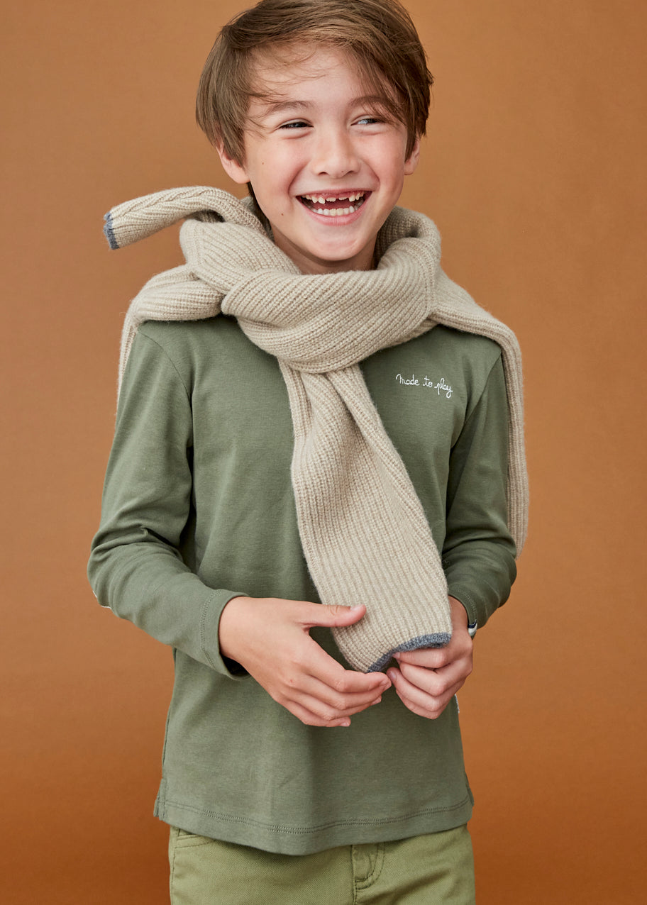 Introducing our boy's long sleeve T-Shirt - a timeless piece to have in every boy’s wardrobe. Made from 100% breathable organic cotton, this soft fabric ensures unparalleled comfort. It features an embroidered "Made to Play" slogan in a playful handwritten font and subtle elbow patches, outlined with delicate stitching. This must-have garment is easy to pull on thanks to its ribbed neck and layers seamlessly under shirts or jumpers.
