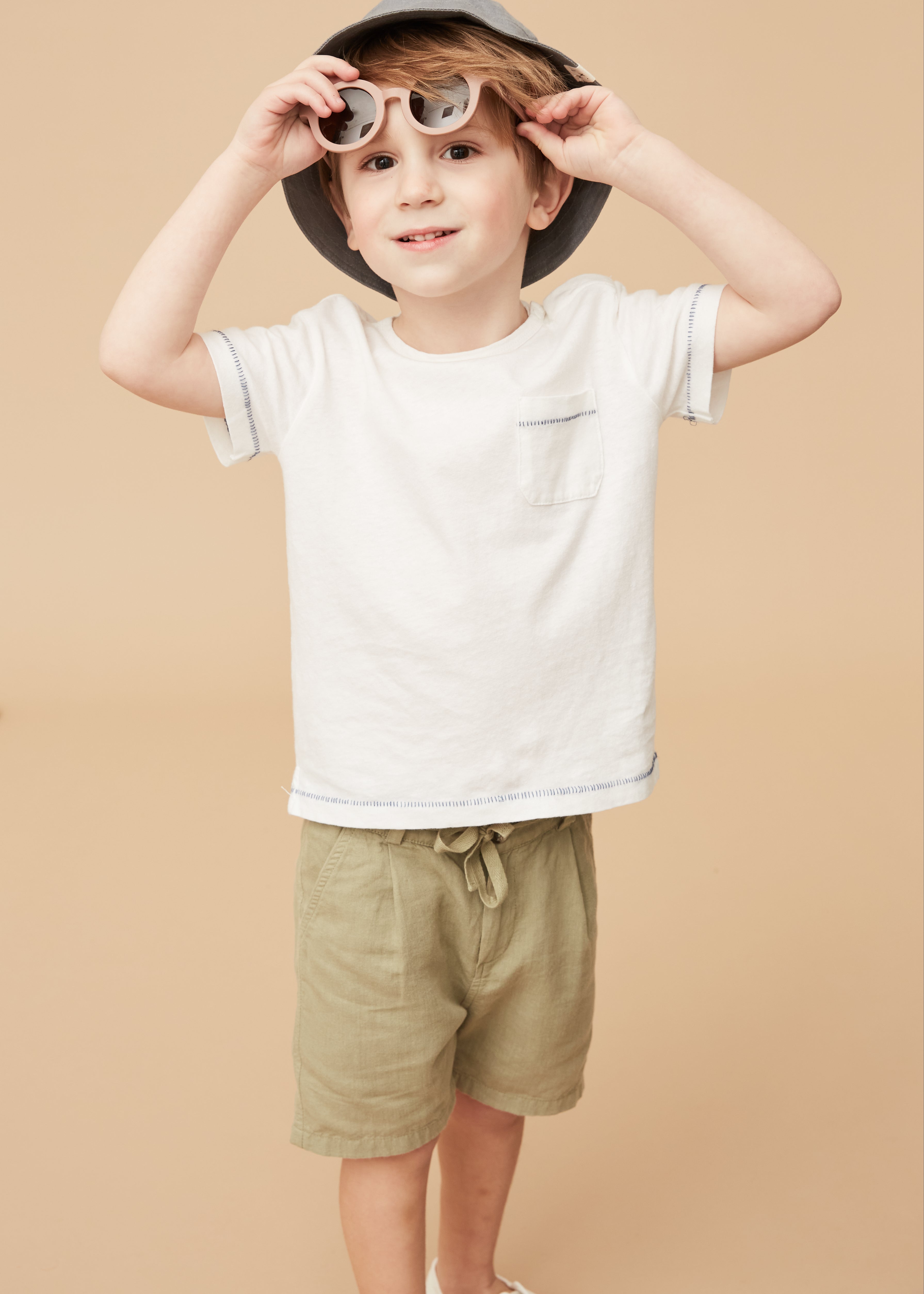 Our boys' Bermuda shorts are crafted from a premium blend of 70% cotton and 30% linen, offering a soft and breathable feel perfect for summer. Designed with a tailored yet comfortable silhouette, these versatile shorts can seamlessly transition from the beach to the city. The colours are achieved through a garment-dye process, creating a stylish light-washed effect. These smart Bermuda shorts feature thoughtful details like a button and zip fastening, a drawstring tie, and sleek slide-side pockets for a streamlined look. The classic length sits just above the knee, and the soft fabric allows the cuffs to be rolled up for a more casual style. The adjustable elasticated waist with hidden internal buttons ensures a perfect fit. Pair these Bermuda shorts with our linen cotton shirts, polos, or cotton knitwear for a smart-casual modern outfit.