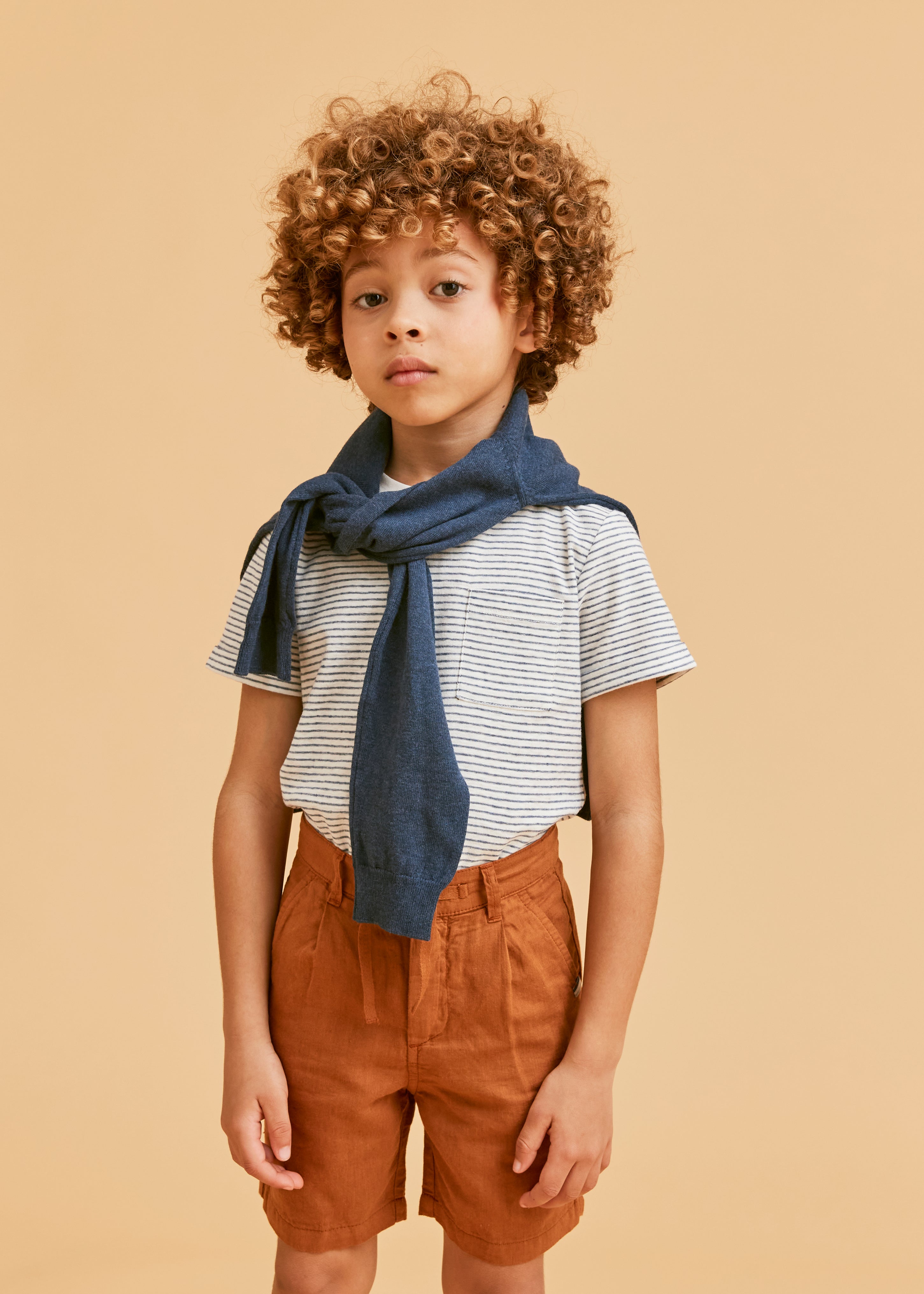 Our boys' Bermuda shorts are crafted from a premium blend of 70% cotton and 30% linen, offering a soft and breathable feel perfect for summer. Designed with a tailored yet comfortable silhouette, these versatile shorts can seamlessly transition from the beach to the city. The colours are achieved through a garment-dye process, creating a stylish light-washed effect. These smart Bermuda shorts feature thoughtful details like a button and zip fastening, a drawstring tie, and sleek slide-side pockets for a streamlined look. The classic length sits just above the knee, and the soft fabric allows the cuffs to be rolled up for a more casual style. The adjustable elasticated waist with hidden internal buttons ensures a perfect fit. Pair these Bermuda shorts with our linen cotton shirts, polos, or cotton knitwear for a smart-casual modern outfit.