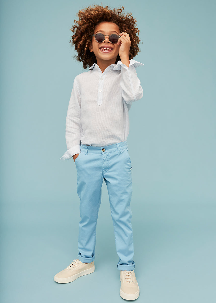 Build your little boy's wardrobe with our boys' chino trousers, a timeless and versatile sartorial essential for everyday wear. Designed with a classic cut, these chino trousers offer endless styling possibilities for any occasion. Crafted from high-quality, lightweight cotton with natural stretch, they provide durability, breathability, and long-lasting comfort. Blended with elastane for added flexibility, these trousers ensure a perfect fit. Featuring a mid-rise cut and the signature J&Josh four-color stitch pocket detail, they also include an adjustable elasticated waist with hidden internal buttons for a customisable fit. Pair these boys' chinos with our linen cotton shirts, polo designs, or cotton knitwear for a smart or casual modern look.