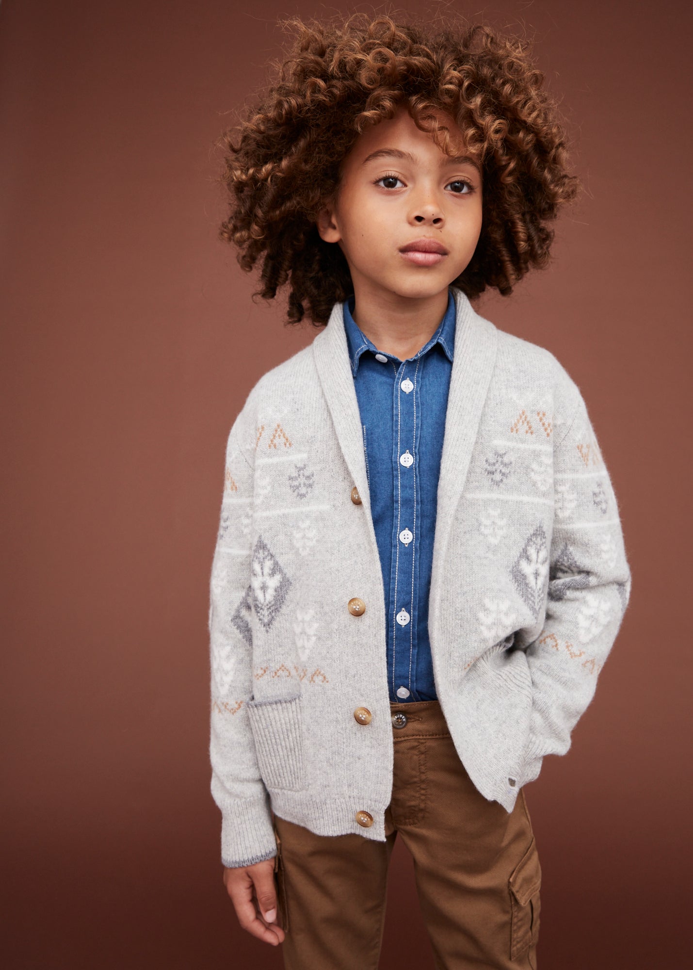 Refined, warm, and effortlessly stylish, our Boys Shawl Collar Cardigan is a standout piece in luxury children's knitwear. Featuring a detailed jacquard design, this Italian-made cardigan blends timeless elegance with everyday versatility.
