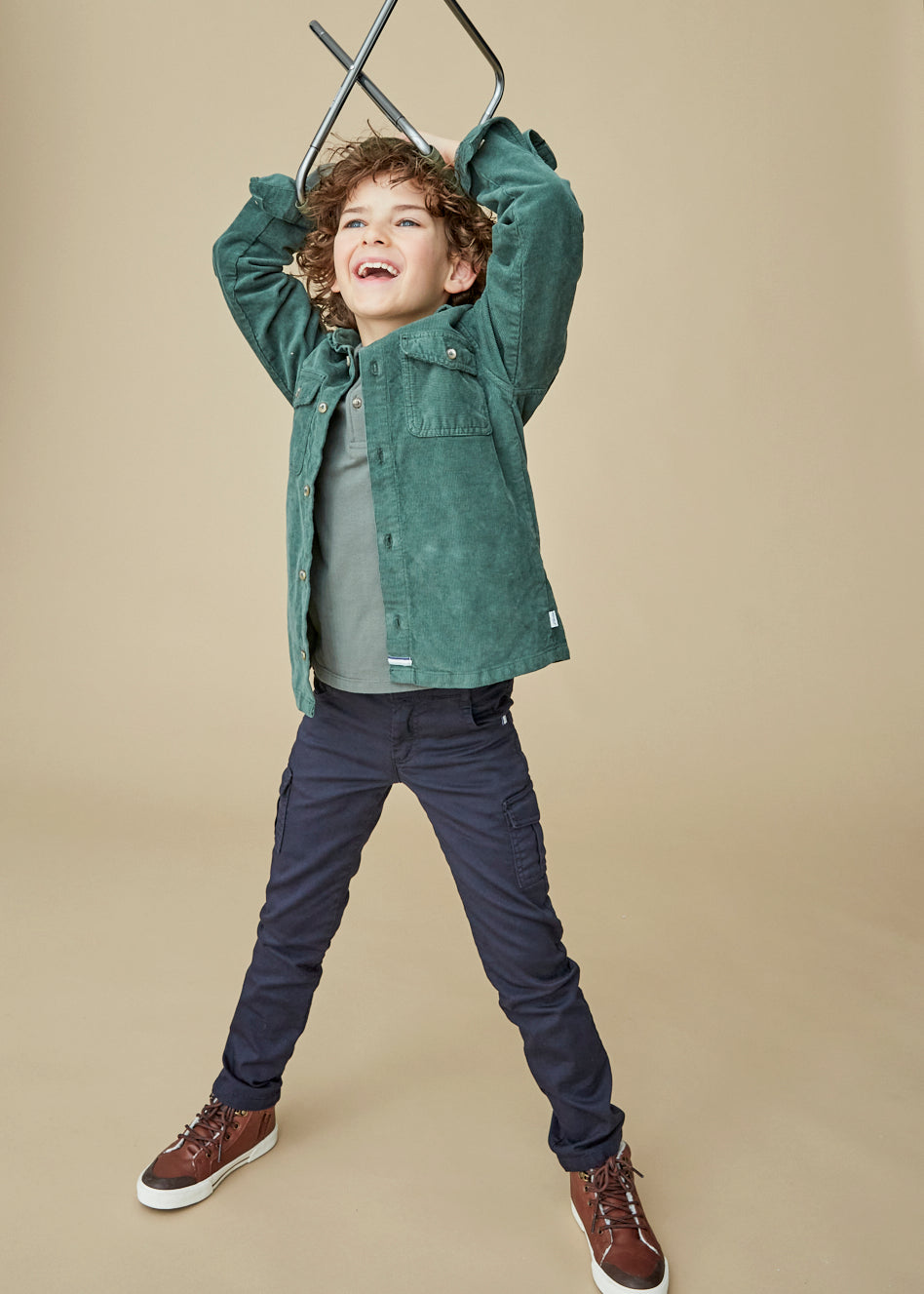 Classic yet contemporary, this boy's long sleeve Polo Shirt embodies our commitment to both quality and style. Crafted meticulously from 95% organic cotton and blended with 5% elastane and carbon finished, this exclusive textile has an extra soft handle, ensuring a delightful wearing experience and ultimate comfort for every adventure. Its timeless elegance and versatility makes it a go-to choice for various occasions; it seamlessly complements both formal and casual settings.  It features a classic collar, mother of pearl buttons and a front pocket. The Polo Shirt strikes a harmonious balance between sophistication and ease, becoming an indispensable staple in any boy's wardrobe. Perfect for layering beneath jumpers and paired with our Corduroy Trousers or Canvas Cargo Chinos.